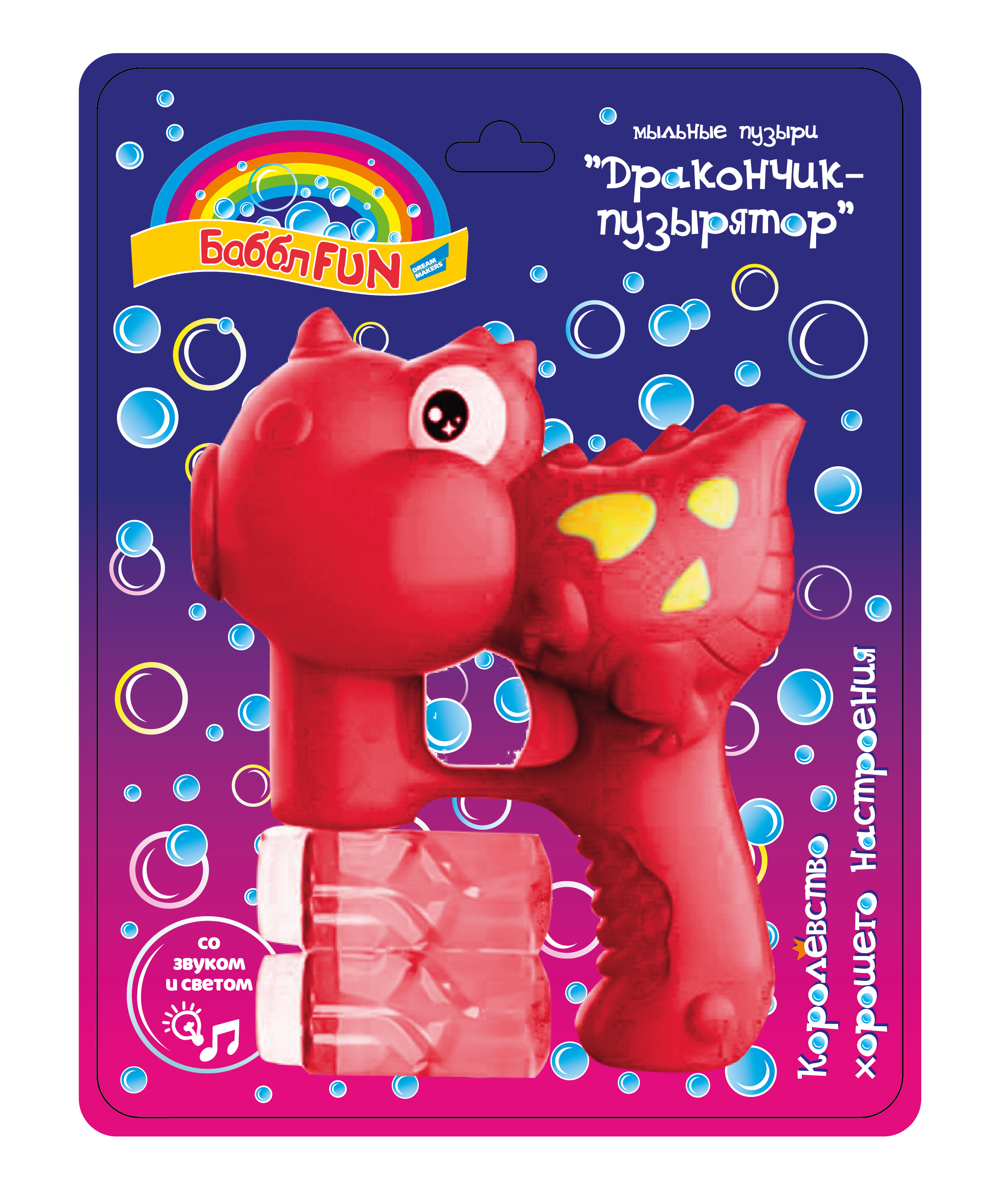 Дракончик-пузырятор. При нажатии на курок из пасти дракона вылетают маленькие мыльные пузыри. Объем мыльного раствора составляет около 50 мл. В игрушке присутствуют световые и звуковые эффекты (из пасти выходит луч света, который подсвечивает пузыри). Комплектность: пузырятор, 2 баночки с мыльным раствором. Для работы игрушки необходимы 3 батарейки AA (в комплект не входят).