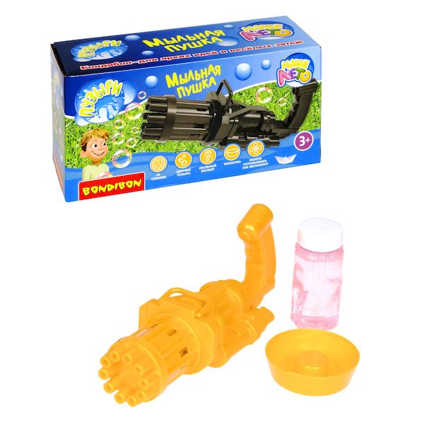 Генератор мыльных пузырей от Bondibon – супер ПУШКА, светится, пускает цветные пузыри мощным потоком и дарит море радости! Мыльные пузыри - одна из любимых игрушек для детей. Что может быть веселее, чем устроить мыльное шоу с пузырями или перестрелки из водных пистолетов на улице, даче или в бассейне? Дети не только развлекаются, в процессе такой игры у ребенка совершенствуется зрительное восприятие, развиваются социальные навыки и зрительно-моторная координация. Работает мыльная пушка очень просто. Налейте мыльный раствор в тарелочку. Погрузите стволы пушки в раствор. Поднимите пушку и нажмите спусковой крючок. Запускайте световое шоу мыльных пузырей сразу из 10 стволов! А еще мыльную пушку можно использовать, как вентилятор. Актуально в жару! В комплект входит: - пистолет-вентилятор золотого цвета - мыльный раствор 50мл - тарелочка. Бластер работает от 3 батареек тип АА. Батарейки в набор не входят. Серия Наше Лето. Возраст 3+