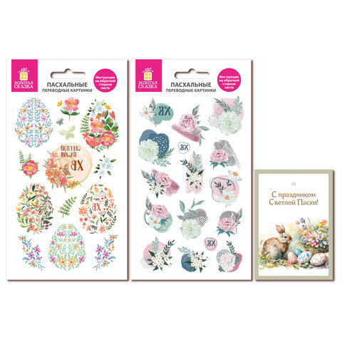 Украсьте пасхальные яйца легко и красиво с набором переводных картинок "Весенние" ЗОЛОТАЯ СКАЗКА! В наборе – 2 листа формата 20х11 см с яркими дизайнами – цветочными весенними композициями (30 картинок в наборе). Как использовать переводные картинки ЗОЛОТАЯ СКАЗКА:1. Вырежьте любую понравившуюся вам картинку.2. Отделите прозрачную защитную пленку.3. Положите картинку лицом вниз на поверхность яйца.4. Смочите ватный диск или салфетку водой и аккуратно, не сдвигая картинку с выбранного места, промокните сверху всю поверхность картинки.5. Подождите 20–30 секунд, пока бумага полностью не пропитается водой.6. Осторожно снимите бумажную основу, начиная с края.7. Дайте яйцу высохнуть 1–2 минуты. Готово!Важно: на листе изображения и надписи отзеркалены – это особенность технологии. Как только картинка переносится на яйцо, текст и рисунки становятся правильными, читаемыми и выглядят безупречно!На обратной стороне каждого листа – понятная инструкция, чтобы каждый справился с украшением с первого раза.В ПОДАРОК – поздравительная пасхальная открытка из плотного картона размером 7х10 см. Переводные картинки пасхальные идеально подходят для семейного творчества, детских праздников, подарочных наборов или оформления пасхального стола.Набор упакован в пакет с клеевым краем и европодвесом.
