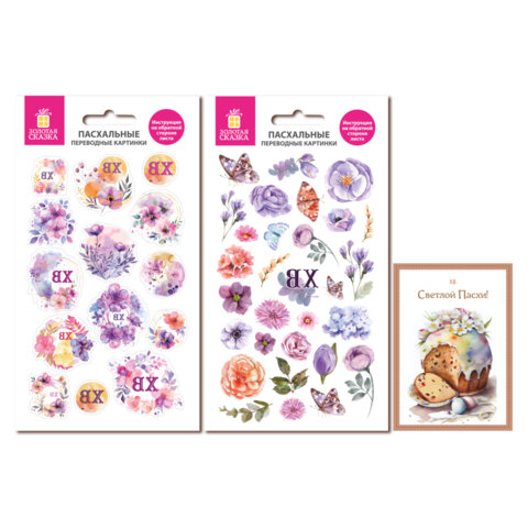 Украсьте пасхальные яйца легко и красиво с набором переводных картинок "Пасхальное чудо" ЗОЛОТАЯ СКАЗКА! В наборе – 2 листа форматом 20х11 см с яркими дизайнами – цветочными весенними композициями (44 картинки в наборе). Как использовать переводные картинки ЗОЛОТАЯ СКАЗКА:1. Вырежьте любую понравившуюся вам картинку.2. Отделите прозрачную защитную пленку.3. Положите картинку лицом вниз на поверхность яйца.4. Смочите ватный диск или салфетку водой и аккуратно, не сдвигая картинку с выбранного места, промокните сверху всю поверхность картинки.5. Подождите 20–30 секунд, пока бумага полностью не пропитается водой.6. Осторожно снимите бумажную основу, начиная с края.7. Дайте яйцу высохнуть 1–2 минуты. Готово!Важно: на листе изображения и надписи отзеркалены – это особенность технологии. Как только картинка переносится на яйцо, текст и рисунки становятся правильными, читаемыми и выглядят безупречно!На обратной стороне каждого листа – понятная инструкция, чтобы каждый справился с украшением с первого раза.В ПОДАРОК – поздравительная пасхальная открытка из плотного картона размером 7х10 см. Переводные картинки пасхальные идеально подходят для семейного творчества, детских праздников, подарочных наборов или оформления пасхального стола.Набор упакован в пакет с клеевым краем и европодвесом.