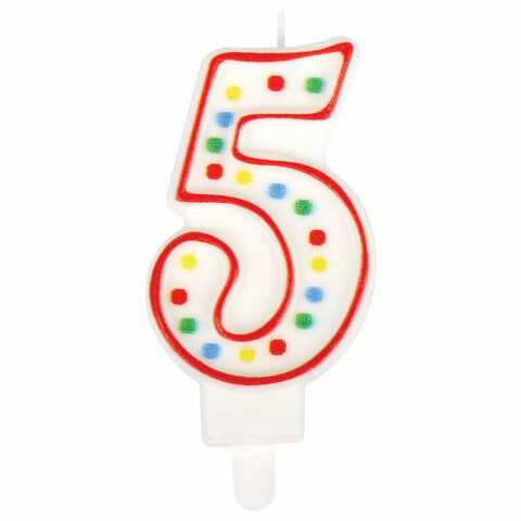 Свечи для торта являются неотъемлемым атрибутом праздника. Свеча-цифра для торта "5" ЗОЛОТАЯ СКАЗКА станет прекрасным украшением торта и других кондитерских изделий по случаю дня рождения, юбилея и любого другого торжества. Двусторонняя свеча с рисунком в виде конфетти представляет собой цифру "5". Свеча выполнена из парафина и укомплектована пластиковым держателем для удобства размещения цифры на торте или другом кондитерском изделии. Высота свечи вместе с держателем - 8,5 см, ширина - 4 см, толщина - 1,2 см.