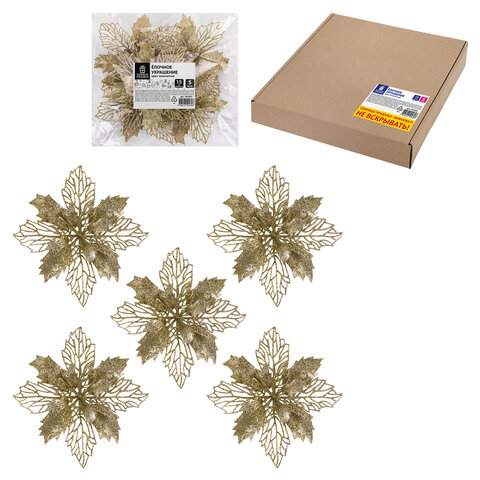 Оригинальным решением украсить новогоднюю ель станут елочные украшения ЗОЛОТАЯ СКАЗКА, выполненные в виде цветов. Изящная пуансеттия крепится на зимнюю красавицу посредством удобной клипсы. Золотистые цветы создают элегантную и гармоничную композицию, которая будет великолепно смотреться на вашей елке. Разместите их по всей высоте ели, чтобы создать праздничный ансамбль, который будет радовать вас и ваших гостей на протяжении всего зимнего сезона. Цветы легко и надежно фиксируются на ветвях, не соскальзывая и не теряясь. Они добавят дому или офису нотку роскоши и изысканности.В комплекте 5 цветков. Цвет: золотистый. Диаметр украшения – 15 см. Материал – ПВХ. Упакованы в картонную коробку.