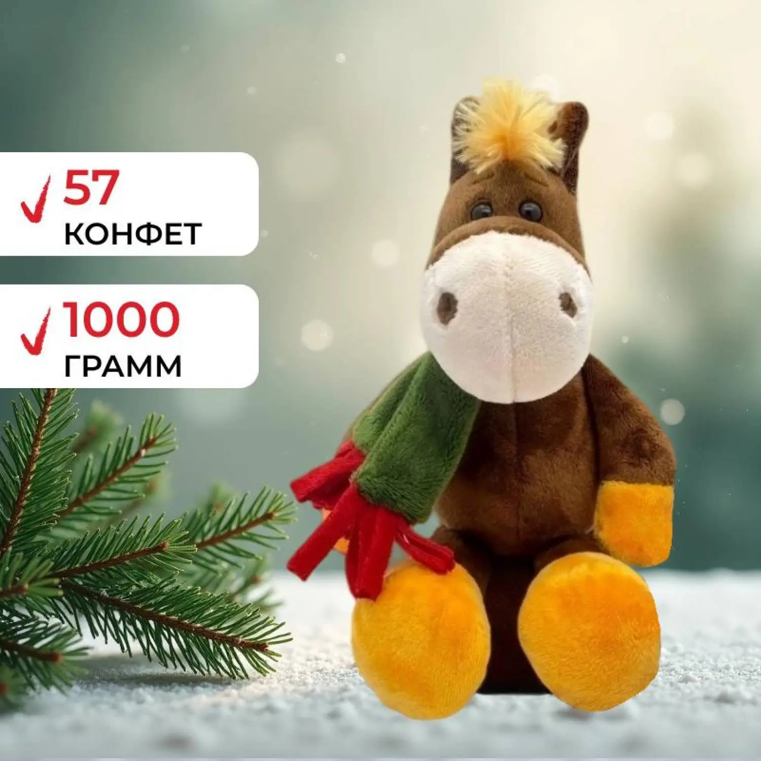 Новогодний сладкий подарок Азбука Праздника Ветерок 1000 г Новогодний сладкий подарок «Ветерок» — это мягкая игрушка, конь в праздничном красном колпачке, который застенчиво смотрит на вас и приглашает поиграть. Сладкое наполнение состоит из продукции лучших российских кондитерских фабрик и не оставит равнодушными маленьких сладкоежек. Размер упаковки: 20?19?22 см. Вес: 1000 г. Вес упаковки: 300 г. Срок годности от даты производства указан на упаковке и составляет 6 месяцев. Состав кондитерского набора: 1. Батончик халва подсолнечная в ассортименте 50 г (Тимоша) — 2 шт. 2. Конфета Бельгийский десерт 23 г (Невский кондитер) — 1 шт. 3. Конфета Пломбирный восторг 14 г (Азовская КФ) — 2 шт. 4. Конфета Шерил сливочный вкус 20 г (Невский кондитер) — 2 шт. 5. Карамель Кремка со вкусом клубники и сливок KDV 6 г — 2 шт. 6. Конфета Щелкунчик с хрустящими вафлями 13 г (Объединённые кондитеры)- 1 шт 7. Конфета Сказочная птица 15 г (Объединённые кондитеры.) — 1 шт. 8. Конфета Сладкая капля 13 г (ПАО «Красный Октябрь») — 1 шт. 9. Конфета Марсианка три шоколада 9 г (Сладкий орешек) — 1 шт. 10. Конфета Марсианка Чизкейк 9 г (Сладкий орешек) — 1 шт. 11. Конфета Sharlet трюфель 5,4 г (Сладкий орешек) — 1 шт. 12. Конфета «Доярушка» 12,1 г (Essen ) - 2 шт. 13. Конфета Bora-Bora лимон 16 г (Сладкий орешек) — 1 шт. 14. Конфета Bora-Bora кокос 16 г (Сладкий орешек) — 1 шт. 15. Конфета Т. Рюффель со вкусом трюфеля и кокоса 16 г (ОАО «Рот Фронт») — 1 шт. 16. Конфета Лукоморье Mini 20 г (Essen ) - 1 шт. 17. Конфета Шокозаврики 37,6 г (Essen ) - 1 шт. 18. Конфета Ромашки лютики глазированные кондитерской глазурью 15 г (Объединённые кондитеры) — 2 шт. 19. Конфета Полюшко с вафлями 15 г (ПАО «Красный Октябрь») — 2 шт. 20. Конфета Фруктовый сад цитрон 15,1 г (Объединённые кондитеры)- 2 шт 21. Конфета Красный Октябрь со вкусом шоколада 14,9 г (Объединённые кондитеры) — 2 шт. 22. Конфета Морские просторы 14,9 г (Объединённые кондитеры.) — 2 шт. 23. Конфета Манёвр нуга с карамелью 32,5 г (Невский кондитер) — 2 шт. 24. Карамель с соком и фруктово-ягодной начинкой ассорти 6 г (KDV) — 2 шт. 25. Конфета Тёмная ночь 20 г (Невский кондитер) — 2 шт. 26. Конфета Melory лимонный курд — клубника 11г (KDV) — 2 шт. 27. Конфета Белая черёмуха 15 г (KDV) — 2 шт. 28. Конфета Му-Муйка 13 г (KDV) — 1 шт. 29. Конфета глазированная мягкая карамель и нуга Rodeo/Родео 15 г (KDV) — 1 шт. 30. Конфета Волшебная лампа 16 г (Невский кондитер) — 2 шт. 31. Конфета Французский десерт со вкусом клубники 22 г (Невский кондитер) — 2 шт. 32. Конфета Белкин лес 12,3 г (Азовская КФ) — 2 шт. 33. Конфета Дольче груша 12,5 г (Азовская КФ) — 2 шт. 34. Конфета Super с нугой и мягкой карамелью 40 г КДВ (KDV) — 2 шт. 35. Печенье-сэндвич Трио Джуниор с начинкой ванильный бум, 45 г (АО «Акконд») — 1 шт. 36. Карамель леденцовая «Nanobons» 4 г (Азовская КФ) — 2 шт. Итого сладостей 57 шт. Внимание! Состав конфет в наборе может быть заменён на аналогичные позиции, в случае отсутствия у фабрики указанной конфеты на момент фасовки набора. Замена конфеты происходит с сохранением категории, ценового сегмента и вкусовых характеристик.
