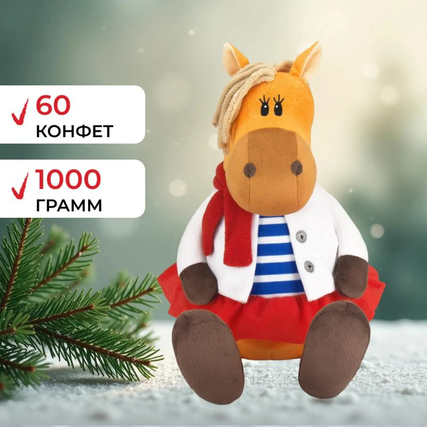 Новогодний сладкий подарок Ура!Подарки Бьянка 1000 г Мягкая игрушка в виде лошади по имени Бьянка выполнена из оранжевого софта и украшена полосатой футболкой с белой рубашкой и красным шарфом. Внутри игрушки находится потайной карман на молнии со сладким набором. Упаковка — игрушка с застёжкой-молнией. Дополнительно в комплект входит пакет. Размер игрушки — 330?180?180 мм. Вес сладкой части подарка без упаковки — 1000 г. Срок годности от даты производства указан на упаковке и составляет 4 месяца. Состав кондитерского набора: — Картошка (Рот Фронт) 15 г — 1 шт. — Желейные (барбарис) (Красный Октябрь) 14 г — 1 шт. — Ёшкина коровка супер сгущёнка (Рот Фронт) 16 г — 1 шт. — Степ (золотой) (Славянка) 21 г — 2 шт. — Томилка (Акконд) 11 г — 1 шт. — Конфета Трио (Акконд) 19 г — 2 шт. — Трамвайчик (Акконд) 10 г — 2 шт. — Амбрель (Акконд) 23 г — 2 шт. — Прохлада (Акконд) 14 г — 2 шт. — Муррлинка со вкусом дыни и клубники (Акконд) 15 г — 2 шт. — Ореховые (Славянка) 13 г — 1 шт. — Toffee Premio (Красный Октябрь) 16 г — 2 шт. — Ярмила (Акконд) 15 г — 2 шт. — Степ десерт с печеньем (Славянка) 19 г — 2 шт. — Батончик (Рот Фронт) 14 г — 1 шт. — Лёвушка (Славянка) 14 г — 2 шт. — Фру 7 (в ассортименте) (Акконд) 10 г — 2 шт. — Медунок карамель, арахис и печенье (Славянка) 19 г — 2 шт. — Астрон нуга и карамель (Акконд) 19 г — 2 шт. — Халветта (Акконд) 13 г — 2 шт. — Отважный комарик (в ассортименте) (Акконд) 11 г — 2 шт. — Зачарованные (Акконд) 17 г — 2 шт. — Конфеты от Красули (Акконд) 13 г — 2 шт. — Голубкина весточка (Акконд) 15 г — 2 шт. — Золотая пора (Акконд) 13 г — 2 шт. — Капелька (в ассортименте) (Акконд) 9 г — 2 шт. — Лесной олень (Акконд) 15 г — 1 шт. — Молочная речка (в ассортименте) (Акконд) 9 г — 1 шт. — Мономикс (Акконд) 10 г — 2 шт. — Марс минис (Марс) 13 г — 1 шт. — Твикс минис (Марс) 9 г — 1 шт. — Птица Зимолюбка (Акконд) 32 г — 1 шт. — Зефир «Обожайка» (Пензенская КФ) 30 г — 1 шт. — Xrust&Go (в ассортименте) (Коломенский) 30 г — 1 шт. — Фараделла (Акконд) 46 г — 1 шт. — Шоколадница (в ассортименте) (Коломенский) 15 г — 1 шт. — Мармелад 67 г (в ассортименте) (Славянка/Азовская КФ) 70 г — 1 шт. — Чувики жевательная конфета (Конфитрейд) 10 г — 1 шт. — Карамель на палочке (Конфитрейд) 11 г — 1 шт. Внимание! Состав конфет в наборе может быть заменён на аналогичные позиции, в случае отсутствия у фабрики указанной конфеты на момент фасовки набора. Замена конфеты происходит с сохранением категории, ценового сегмента и вкусовых характеристик.
