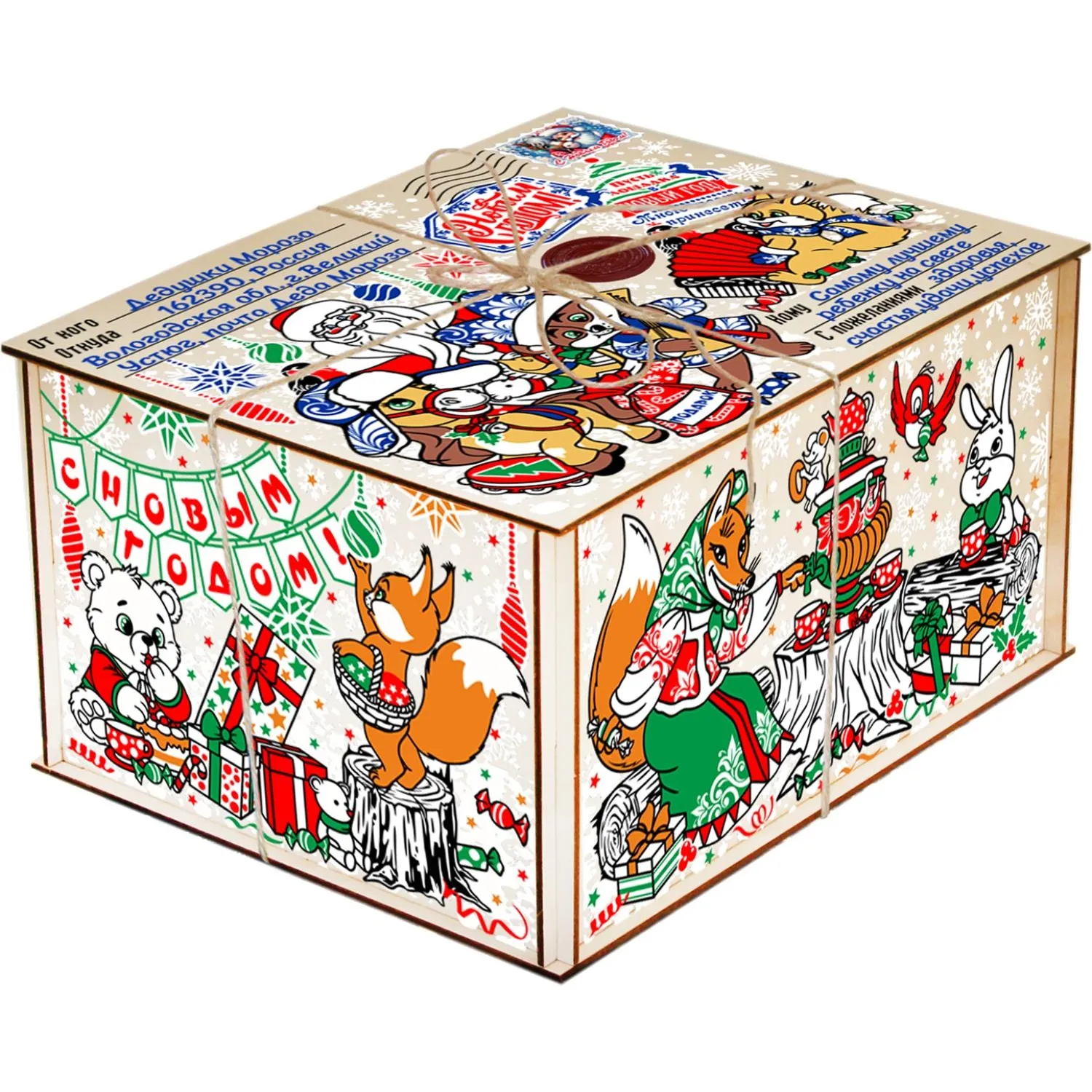 Новогодний сладкий подарок Посылка из леса Фанера 1000 грамм, K074