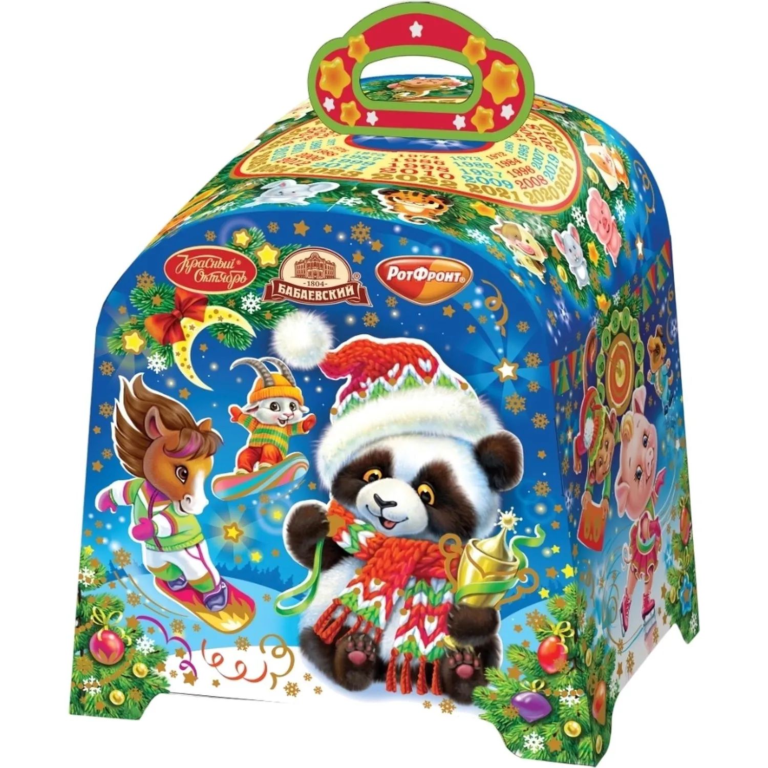 Новогодний сладкий подарок Объединённые кондитеры Шоколадный зодиак 1000 г Новогодний сладкий подарок «Шоколадный зодиак» — это яркий картонный сундучок с целым килограммом сладостей. Внутри собраны конфеты и шоколад от легендарных фабрик России, среди которых классические, вафельные и помадные сладости, а также трюфели и грильяж. Такой набор порадует любителей разнообразных вкусов и станет достойным угощением на праздничном столе. Производитель «Объединённые кондитеры». В набор входят: 1. Конфета «Визит» 15.2 г — 2 шт. 2. Конфета «Бабаевские» 14.9 г — 2 шт. 3. Конфета «Кара Кум» 15 г — 3 шт. 4. Конфета «Восточные мотивы» 15 г — 3 шт. 5. Конфета «Маков цвет с воздушным рисом» 15 г — 3 шт. 6. Конфета «Петушок масляна головушка» 15 г — 1 шт. 7. Конфета «Восточный грильяж» 13.3 г — 2 шт. 8. Конфета «Мишка Косолапый Медовый грильяж» 13.7 г — 2 шт. 9. Конфета «Мама приехала» 13 г — 2 шт. 10. Конфета «Ну-ка, отними шоколадный крем» 10.4 г — 2 шт. 11. Конфета «Птичье молоко сливочно-ванильные» 14.1 г — 3 шт. 12. Конфета «Вафельные конфеты Мореход» 55 г — 2 шт. 13. Конфета «Озорной мишка со вкусом пломбира» 55 г — 2 шт. 14. Конфета «Вафельные конфеты Коровка Молочная» 20 г — 2 шт. 15. Конфета «Вафельные конфеты Артек» 20 г — 2 шт. 16. Конфета «Ласточка сормовская» 14.9 г — 3 шт. 17. Конфета «Матрёшка с печеньем» 13.5 г — 3 шт. 18. Конфета «Матрёшка» 12.5 г — 3 шт. 19. Конфета «Трюфели Сормовские» 14 г — 3 шт. 20. Конфета «Батончики Рот Фронт» 14 г — 3 шт. 21. Шоколад «Бабаевский» с помадно-сливочной начинкой 50 г — 1 шт. 22. Шоколад «Алёнка» 15 г — 1 шт. 23. Вафли «Коровка с шоколадной начинкой» 75 г — 1 шт. Размер упаковки — 183?225?137 мм. Вес без упаковки: 1000 г. Вес упаковки 78 г. Срок годности от даты производства указан на упаковке и составляет 6 месяцев. Сундучок выполнен из прочного картона. Такой подарок подойдёт и детям, и взрослым, создавая праздничное настроение и наполняя дом ароматом любимых конфет. Внимание! Состав конфет в наборе может быть заменён на аналогичные позиции, в случае отсутствия у фабрики указанной конфеты на момент фасовки набора. Замена конфеты происходит с сохранением категории, ценового сегмента и вкусовых характеристик.