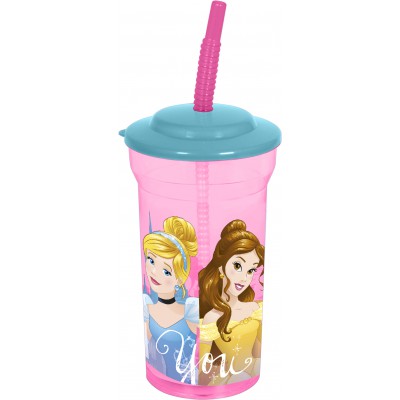 Стакан пластиковый с соломинкой и крышкой (прозрачный, 460 мл). Принцессы Дружные приключения