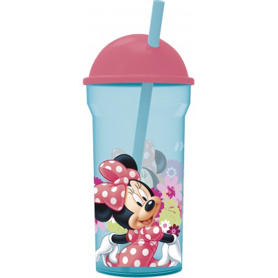 Стакан пластиковый с соломинкой и крышкой-полусферой (прозрачный, 460 мл). Минни Маус Цветы