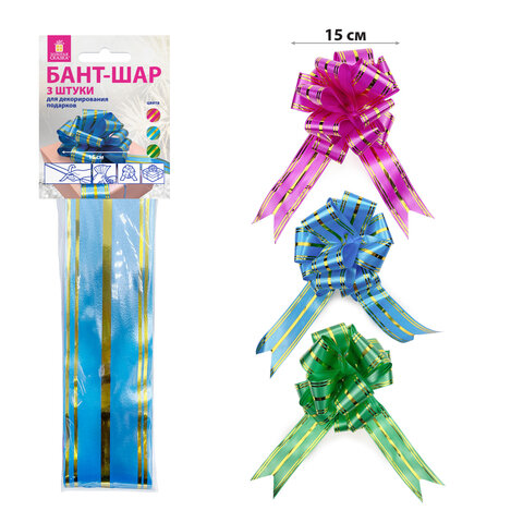 Бант-шар d = 15 см для подарка НАБОР 3 шт., золотые полосы, фуксия, бирюза, зеленый, ЗОЛОТАЯ СКАЗКА, 591836