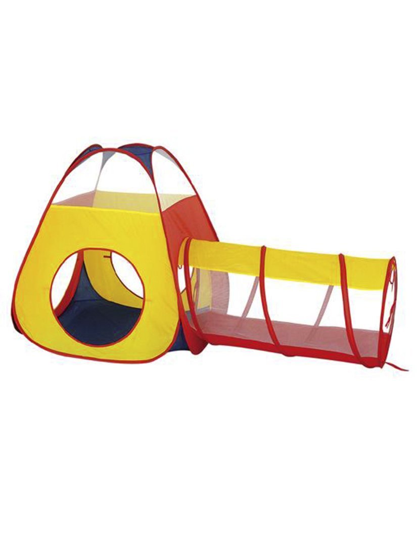 Игрушка, вмещающая в себя ребенка: Палатка с туннелем. Размер палатки в разложенном виде (ДхШхВ) составляет 88х88х90 см, размер туннеля: 50х50х100 см.