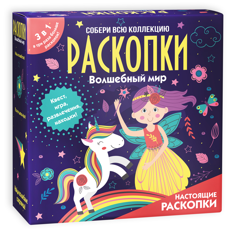 Мечтаете побывать в стране Фей? В этом квесте вам предстоит туда отправиться! А ещё спасти бабочек, заточенных в камень, разгадать загадку единорогов и познакомиться еще с парой волшебных существ, которые поделяться секретом о спрятанных сокровищах. В наборе вы найдете три бруска для раскопок с настоящими волшебными находками, а также настольную игру, книжку с квестом и три открытки для раскрашивания с единорогами и феями. Набор разработан в формате квеста. За каждое выполненное задание ребенок получает букву. В конце из этих букв получится секретный ингридиент эликсира фей, который вернёт путешественника домой. Кстати, элексир фей очень вкусный, обязательно попробуйте! Все найденные в путешествии сокровища можно сложить в специальный сундучок, который есть в комплекте. Вместе с феями раскрасьте его в яркие цвета! В конце ребенок получит почетный диплом настоящего кладоискателя, а потом нарисует полюбившегося персонажа. В наборе: буклет с заданиями, настольная игра, кубик, фишки, три бруска для раскопок, инструменты для раскопок, сундучок для сокровищ, диплом кладоискателя. Цвета находок в ассортименте.