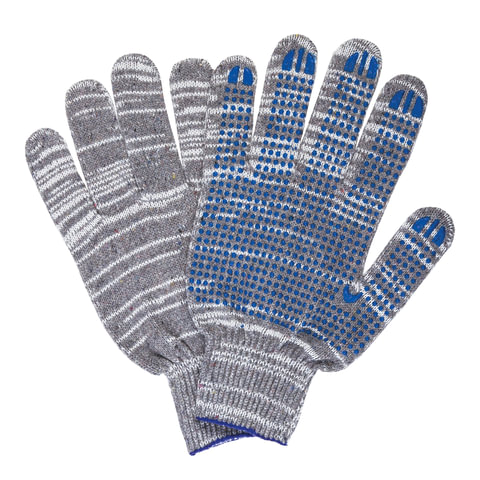 Хлопчатобумажные перчатки LAIMA "ЛЮКС" позволяют защитить руки от внешних воздействий в процессе физических нагрузок. Изготовлены из хлопчатобумажной пряжи плотностью 133 текс с покрытием из поливинилхлорида с нанесением рисунка на внутреннюю сторону перчатки. Покрытие ПВХ помогает обеспечить плотный захват и предотвращает соскальзывание детали. Резинки на манжетах обеспечивают плотное прилегание перчатки к руке. Перчатки серого цвета имеют 10 класс вязки. Вес пары - 50-52 г. Поставляются в комплекте 5 штук в полиэтиленовой упаковке.СПРАВОЧНАЯ ИНФОРМАЦИЯ:На последнем фото можно ознакомится с визуализацией разницы между 7 и 10 классами вязки перчаток.7 класс вязки – менее плотное плетение и более толстые нити.10 класс вязки – более плотное плетение и стандартные нити, тоньше, чем используемые в 7 классе.13 и 15 классы, к примеру, с еще более мелкой структурой вязки, с применением более тонких нитей, чем при вязке 7 и 10 класса.13 и 15 классы вязки перчаток – еще более плотная вязка и более тонкие, но при этом более прочные нити, чем в 7 и 10 классах. Чем выше класс вязки, тем более тактильные перчатки.Х/б основу 13 и 15 классов применяют для более дорогих перчаток и используют как основу для перчаток с латексным, нитриловым и другими обливами, т.к. плотная вязка не дает обливу проникнуть внутрь перчатки, а позволяет равномерно распределиться по поверхности.