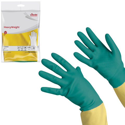 Усиленные перчатки для специальных работ изготовлены из натурального латекса с неопреновой обработкой, что делает их необыкновенно прочными. Защищают от агрессивной химии, очень стойкие к механическому воздействию, обеспечивают комфорт при уборке. Особенности и преимущества:- сверхпрочные трехслойные латексно-неопреновые перчатки подходят для интенсивной работы с использованием агрессивных моющих средств,- максимальная устойчивость к изнашиванию и разрывам,- хлопковая подкладка для комфортного ношения,- низкая теплопроводность – дополнительная защита рук при работе с горячей водой,- рельефная сетчатая структура на ладонях и пальцах для надежного захвата,- аккуратный волнообразный обрез манжеты,- не имеют резкого и специфичного запаха резины,- можно стирать и сушить,- высокая химическая сопротивляемость,- подходят для чистки, сельскохозяйственных работ, приготовления пищи и упаковки.Состав: латекс (натуральная резина) и неопрен, наполнитель, вулканизирующие агенты, стабилизаторы, оксид цинка, цветные пигменты, хлопковая подкладка, ZDEC (диэтилдитиокарбамат цинка).Гигиена рук очень важна для профилактики кожных заболеваний и предотвращения риска заражения. Вот почему Vileda Professional изготавливает перчатки самого высокого качества, каждая пара которых проверяется, чтобы исключить брак.
