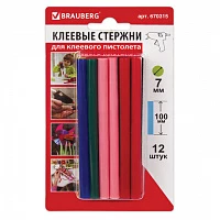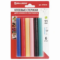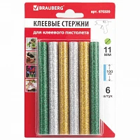 Клеевые стержни, диаметр 7 мм, длина 100 мм, цветные (ассорти), с блестками, комплект 6 штук, BRAUBERG, 670318