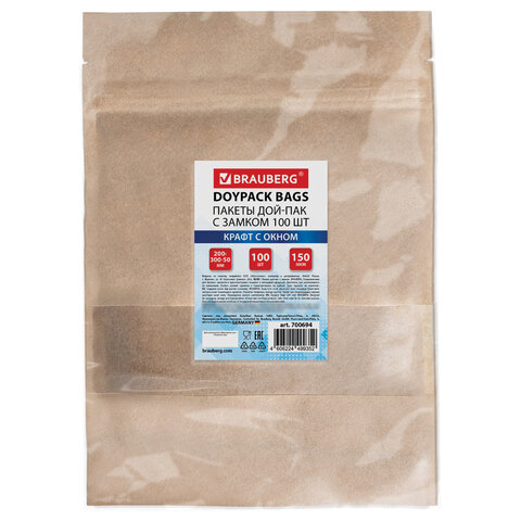 Пакеты дой-пак BRAUBERG – современное решение для хранения и перевозки продуктов. Устойчивое дно и герметичная застёжка сохраняют свежесть, а компактный дизайн обеспечивает удобство и привлекательный внешний вид. Пакеты дой-пак BRAUBERG – современный формат упаковки, идеально подходящий для хранения и транспортировки самых разных продуктов: круп, орехов, сладостей, чая, кофе и др. Благодаря эргономичной форме они занимают минимум места, а застежка ZIP LOCK обеспечивает герметичность и защиту от влаги, воздуха и загрязнений. Снаружи изделия выполнены из крафт-бумаги, внутри – из прозрачного полиэтилена, и оснащены окошком 60х200 мм для удобной идентификации содержимого.Размер пакета: 200х300 мм.Ширина дна: 50 мм.Плотность: 150 мкм.Комплект – 100 штук.