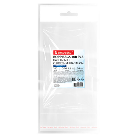 Пакеты БОПП с европодвесом, клеевым клапаном, КОМПЛЕКТ 100 штук, 10х16 + 3 + 4 см, белая подложка, BRAUBERG, 700416