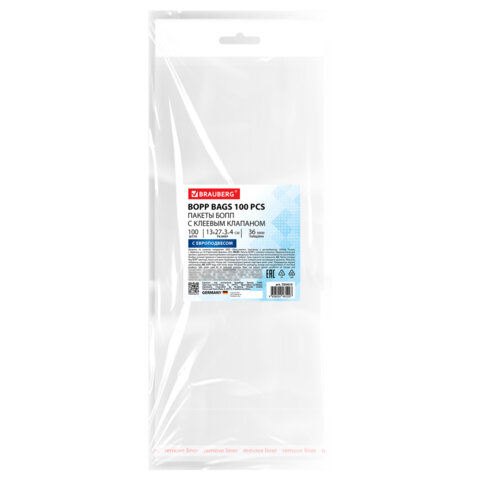 Пакеты БОПП с европодвесом, клеевым клапаном, КОМПЛЕКТ 100 штук, 13х27 + 3 + 4 см, белая подложка, BRAUBERG, 700415