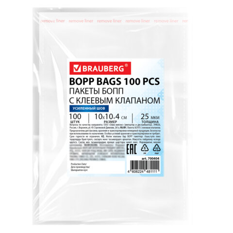 Пакеты БОПП с клеевым клапаном, КОМПЛЕКТ 100 штук, 10х10 + 4 см, 25 мкм, с усиленным швом, BRAUBERG, 700404