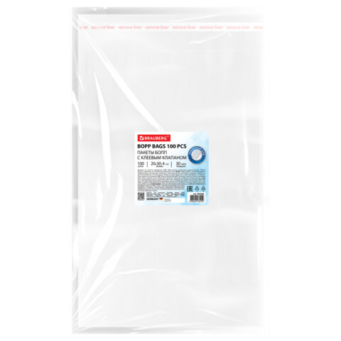 Пакеты БОПП с клеевым клапаном, КОМПЛЕКТ 100 штук, 20х30 + 4 см, 30 мкм, с усиленным швом, BRAUBERG, 700408