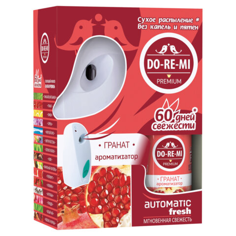 Автоматический диспенсер с освежителем воздуха DO-RE-MI "Гранат" подарит вашему дому комфорт, уют и свежесть граната. Автоматический диспенсер + 2 батарейки. Действует до 60 дней при интервале распыления 30 минут. Применять при температуре не ниже +10 °С.Способ применения. • Замена баллона: переведите переключатель в положение OFF, извлеките пустой баллон из устройства согласно инструкции по эксплуатации. Вставьте сменный баллон носиком наружу. Не направляйте в лицо при включении или установке интервала распыления. • Переведите переключатель в положение ON, выбрав желаемый интервал распыления. Первое распыление начнется автоматически через несколько секунд. Универсальный сменный аэрозольный баллон можно использовать без автоматического устройства, как обычный аэрозольный освежитель воздуха.Состав: углеводородный пропеллент (бутан/ пропан/изобутан смесь) не менее 30%, спирт этиловый денатурированный не менее 30%, пропиленгликоль 5-15%, отдушка 5–15%, аллергены: гексилциннамаль, бензилсалицилат, линалоол, гидроксизогексил 3-циклогексен карбоксальдегид, лимонен, альфа-изометилионон, цитронеллол, линалоол.ТУ 20.41.41-119-00204292-2017