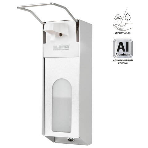 Тип подачи: спрей (с насадкой-распылителем) или капельный (без насадки-распылителя). Используемые средства: антиспептик или дезинфицирующее средство (с насадкой-распылителем), жидкое мыло или гелеобразный антисептик (без насадки-распылителя). Наливной диспенсер имеет объем 1 л. Антивандальный корпус устройства выполнен из алюминия. Механизм подачи расходных материалов при помощи локтевого привода позволяет избежать контакта рук с поверхностью диспенсера. Выдача жидкого антисептика осуществляется экономичными порциями. Диспенсер сочетается с расходными материалами других производителей. В комплект входят крепежные элементы. Оборудован замком с ключом.Особенности: подходит как для антисептиков и дезинфицирующих средств в жидкой не гелеобразной форме, так и для обычного жидкого и мыла и антисептиков в форме геля. При необходимости использовать гелевое средство или жидкое мыло открутите белую насадку распылителя (насадка имеет резьбовое соединение).Внимание! Перед применением рекомендуем сначала прокачать помпу диспенсера. Для этого, прежде чем залить жидкий антисептик в диспенсер, нажмите несколько раз на рычаг, чтобы удалить воздух из насоса.Преимущества диспенсера для антисептика, дезинфицирующих, а также асептических средств с локтевым приводом:1) локтевой привод обеспечивает повышенную гигиеничность;2) удобен в использовании;3) возможность избежать передачи микробов другому пользователю;4) практичность;5) простота ухода;6) наличие еврофлакона в комплекте.