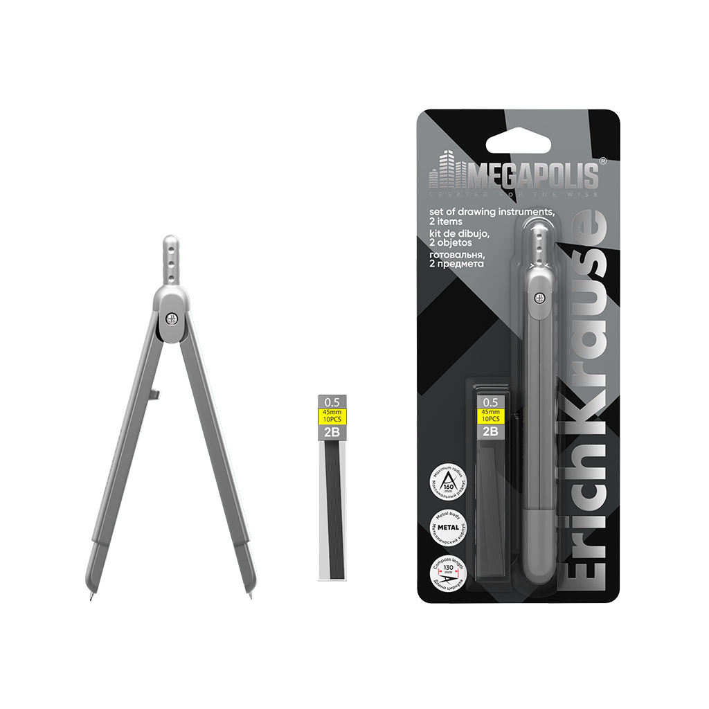 Готовальня ErichKrause Megapolis, (металлический циркуль и сменные грифели), блистер, серебряный