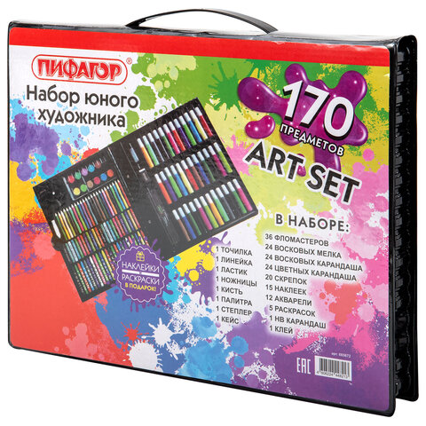 Набор юного художника ПИФАГОР отлично подойдет для первых шагов в рисовании. В красочном кейсе есть все необходимые предметы для развития творческих способностей ребенка. Набор представляет собой кейс с красочным дизайном и грамотно подобранным наполнением из 170 предметов. Кейс раскладывается как книга. Каждый предмет надежно закреплен в ячейке. Надежный корпус кейса гарантирует полную защиту внутреннего наполнения от повреждений. Набор надежно упакован в воздушно-пузырчатую пленку и короб из гофрокартона. Набор удобно брать с собой в школу или в любые поездки. В набор входят: высококачественные цветные карандаши – 24 цвета; яркие восковые мелки – 24 цвета; восковые карандаши – 24 цвета; удобные мини-фломастеры – 36 цветов; насыщенные акварельные краски – 12 цветов; скрепки – 20 штук; чернографитный карандаш – 1 штука; кисть из синтетики – 1 штука; палитра – 1 штука; раскраски – 5 листов; ластик – 1 штука; наклейки – 15 штук;точилка – 1 штука; линейка – 1 штука; пластиковые безопасные ножницы – 1 штука; степлер – 1 штука; клей – 1 штука; раскладывающийся кейс с красочным дизайном.