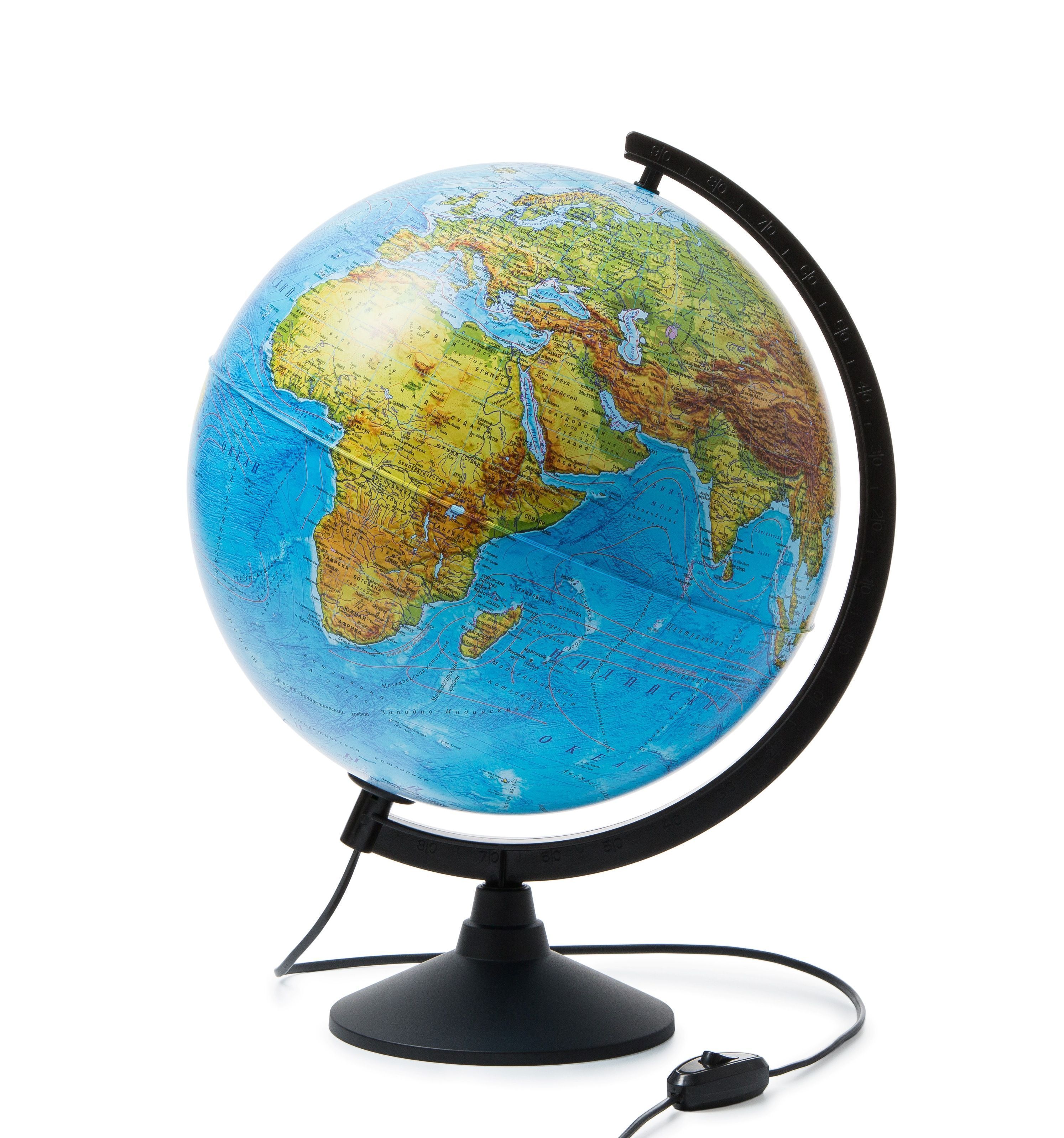 Классический глобус для обучения детей географии и политического устройства мира.Сфера изготовлена из пластика.Диаметр сферы 32 см.Устойчивая настольная подставка из черного пластика.Карта максимально подробная для данного диаметра глобуса.Линия экватора выпуклая для тактильно восприятия.Карта двойная физико-политическая, отражает одновременно ландшафт нашей планеты и политико-административное устройство нашего мира.Изоборажение карты соответсвует принятым мировым картографическим стандартам условного обозначения ландшафта и стран.Подсветка работает от электросети.Лампа подсветки съемная, цоколь Е14