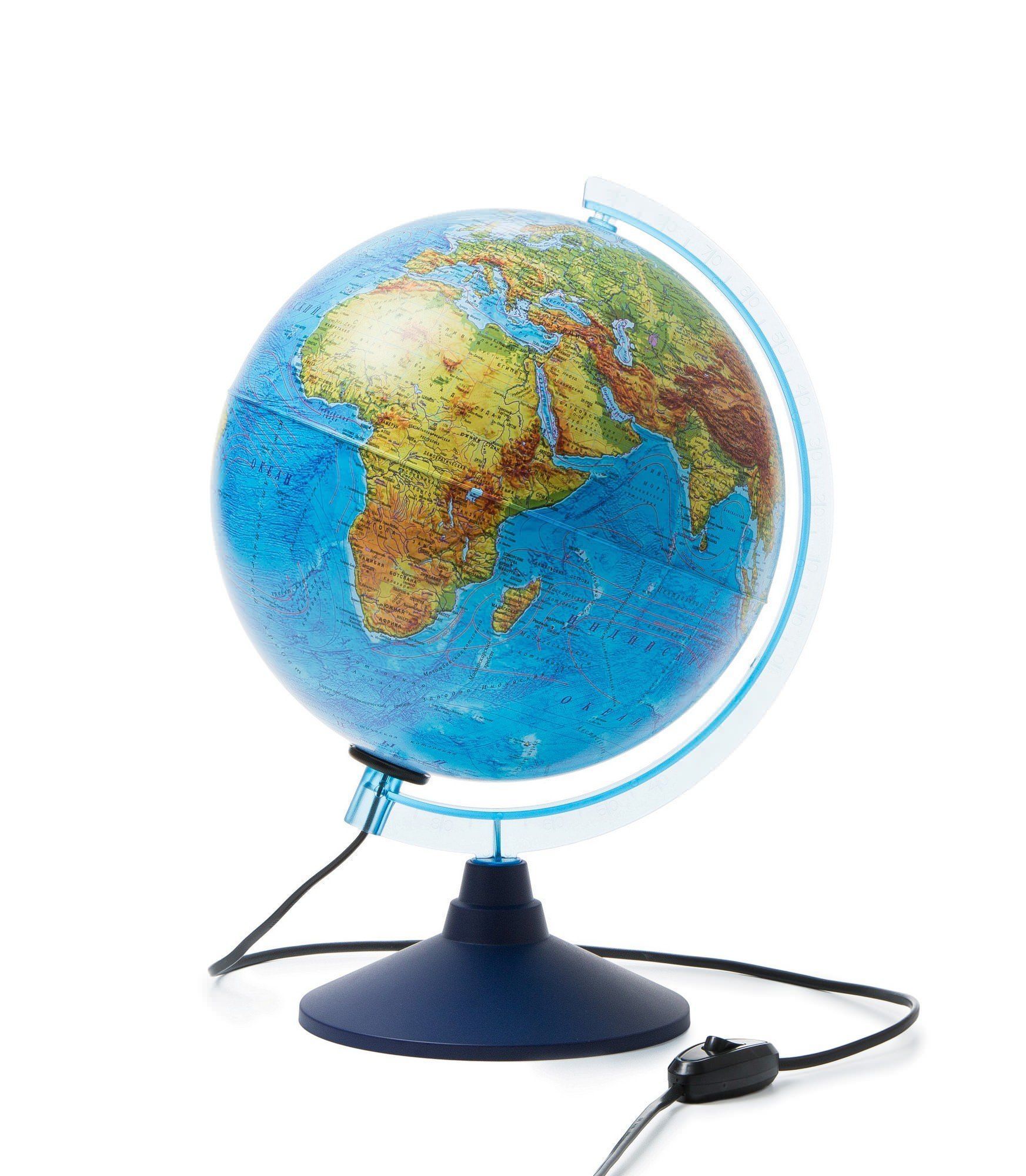 Интерактивный рельефный глобус Земли - это новинка не только в ассортименте глобусов, но и в методах обучения ребенка, развития его тяги к знаниям, умении усваивать новую информацию. Всё, что потребуется от родителей, помочь малышу сделать первый шаг к новым открытиям.Глобус достаточно большой, его сфера имеет диаметр 25 см.Настольная подставка яркого синего цвета и голубой меридиан.Поверхность рельефная, рельефом обозначены возвышенности ландшафта Земли.Подсветка от электросети превращает физическую карту глобуса в политическую. Обе карты очень подробные, выполнены с полным соблюдением масштаба и установленных условных обозначений.Такой глобус является полноценным учебным пособием для изучения географии, истории, окружающего мира и политико-административного устройства нашей планеты.Но использовать его можно не только для серьезной учебы школьников, но и для развития детей дошкольного возраста буквально с 3-х лет