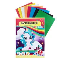 Картон цветной А4 8 листов, 8 цветов, "Единорог", немелованный 220 г/м2, в папке
