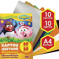 Картон цветной А4, 10 листов, 10 цветов, волшебный (золото+серебро) мелованный 230 г/м2