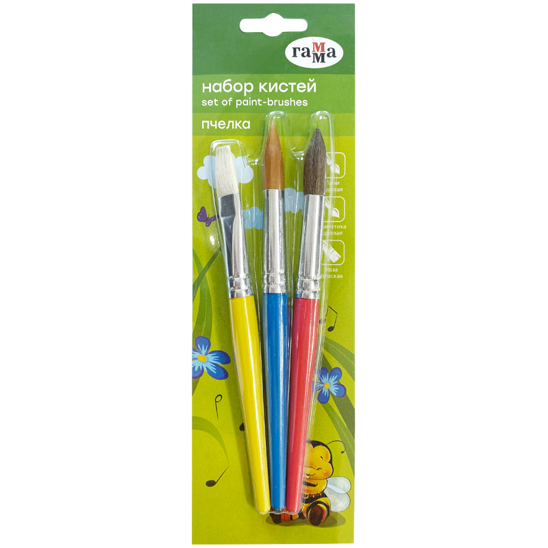 Набор кистей Гамма "Пчелка", 3шт., утолщ., пони круглая, синтетика круглая, коза плоская, блистер, европодвес