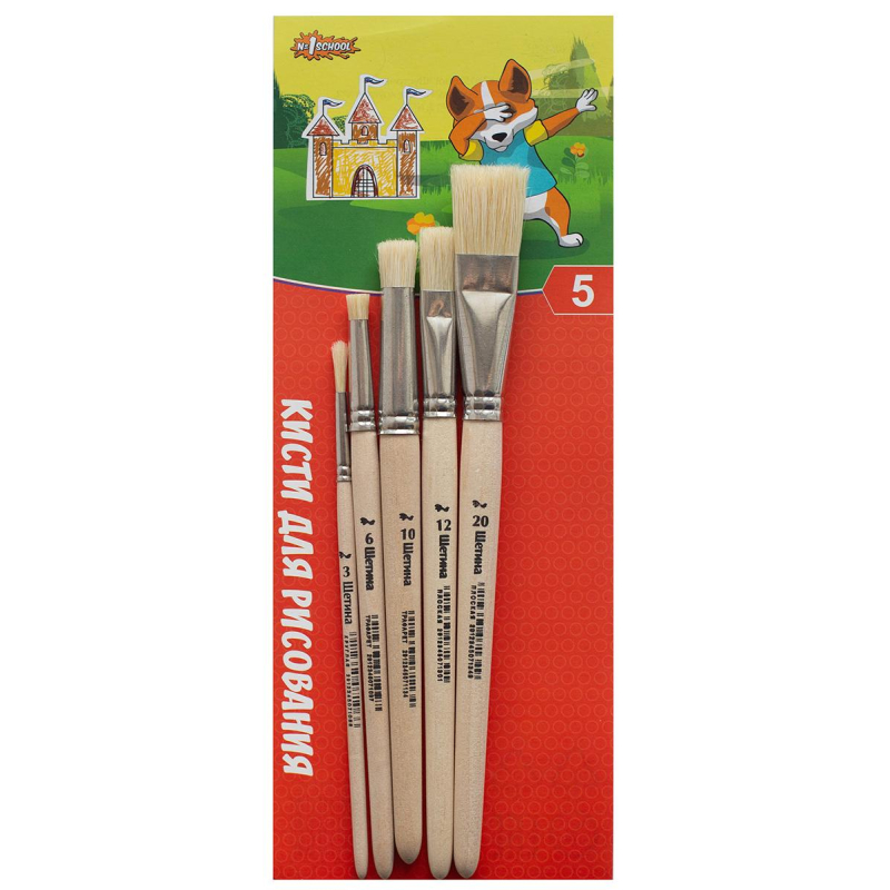 Кисть набор №1 School Шустрики щетина кругл.3,трафарет 6,10, плоск.12,20