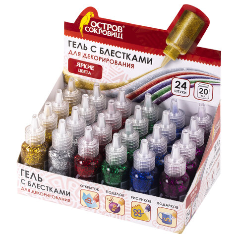 Гель с блёстками ОСТРОВ СОКРОВИЩ - это блестящие наборы для творчества и декорирования поделок из бумаги, картона, дерева, пластика и других материалов. Удобный наконечник с дозатором позволяет легко наносить гель на любую поверхность.
