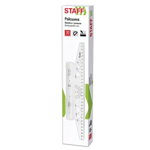 Линейка с роликом (рейсшина) STAFF идеально подойдет для нанесения ровных параллельных линий. Легкая в использовании и удобная в транспортировке как для студентов, так и для офисных работников. Изготовлена из высокопрочного пластика. Оснащена металлическим антискользящим роликом, на котором изображена измерительная шкала и геометрические формулы. Длина шкалы составляет 30 см. На линейку нанесена измерительная шкала и шкала транспортира. Также снабжена трафаретом окружностей различных диаметров. На ролике нанесена дополнительная шкала и геометрические формулы.