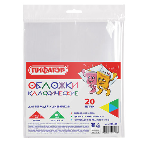 Обложки ПП для тетради и дневника ПИФАГОР, комплект 20 шт., прозрачные, 40 мкм, 210х350 мм, 223485