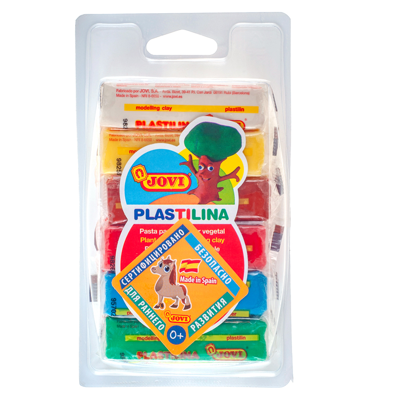 Пластилин JOVI имеет российскую сертификацию для самых маленьких детей до трех лет. Рекомендован Российским Государственным Медицинским Университетом для развития творческих способностей ребенка и входит в списки для покупки родителями во многих детских садах, школах, детских центрах и студиях. Легендарный пластилин JOVI на растительной основе идеален для начала обучения лепке и для уроков в школе и творческих студиях. Благодаря усовершенствованной формуле с воском пластилин JOVI безопасен, обладает повышенной пластичностью, хорошо лепится, прекрасно держит форму, не деформируется, легко извлекается из формочки, не крошится, не высыхает, цвета прекрасно смешиваются между собой, слепленные фигурки не опадают со временем. Используется для техники "Рисование пластилином" и пластилиновой мультипликации. Не пачкает руки, снимается с любой поверхности без усилий, не оставляя пятен. Без консервантов, не содержит глютен и основные аллергенные компоненты. Набор пластилина на растительной основе из 6 базовых цветов (белый, желтый, красный, голубой, зеленый, коричневый) по 25 грамм в плотном блистере. Страна производства Испания.
