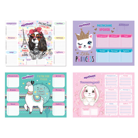 Расписание уроков и звонков А4, ЮНЛАНДИЯ, "весёлые зверята", ассорти (4 вида), бумага 170 г/м2, 111655