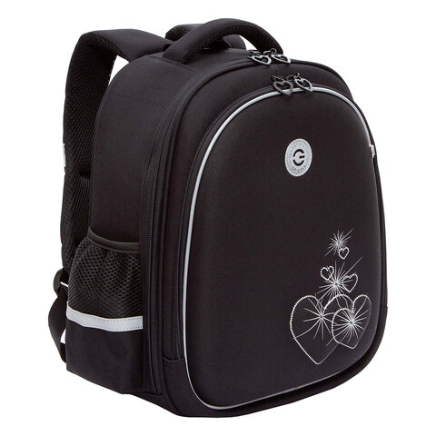 Ранец GRIZZLY анатомическая спинка, c брелоком, для девочек, "HEARTS", чёрный 36х28х20 см, RAz-586-5/1