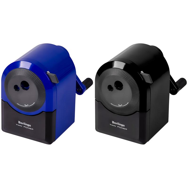 Точилка Berlingo "TwinPower" 2 в 1. Имеет увеличенный диаметр отверстия для заточки. С помощью вращающегося колесика можно выбрать диаметр карандаша для заточки: стандартный или утолщенный. Регулятор заточки: 5 степеней остроты, от самого острого для чернографитных, до круглого для цветных карандашей - переключение на ручке. Механизм фиксации карандаша снабжен резиновыми держателями, что исключает возможность его повреждения. Кнопка на оборотной стороне точилки для извлечения застрявшего грифеля. Точилка надежно крепится к столу струбциной (в комплекте). Вместительный контенейнер для стружки. Обеспечивает превосходную заточку любых видов карандашей. Цвета ассорти: черный, синий. Упаковка - индивидуальные прозрачные ПВХ-коробки.