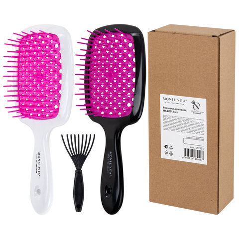 Расческа для волос массажная 20х8,5 см, НАБОР 2 шт. + щетка для чистки В ПОДАРОК, MONTE VITA (МОНТЕ ВИТА), 457434