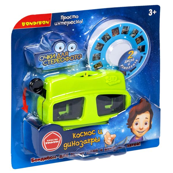Очки-стереоскоп для просмотра 3D фотографий "КОСМОС И ДИНОЗАВРЫ" от Bondibon – это очаровательная игрушка в стиле ретро, позволяющая рассматривать объемные изображения. Хотите увидеть 3D динозавров или совершить впечатляющее путешествие в космос? Тогда вам нужны cтереоочки от Bondibon! Для просмотра объемных картинок необходимо поместить в портативный проектор диск с цветными слайдами и надеть очки на голову. Яркость изображения регулируется уровнем окружающего освещения. Батарейки не потребуются. Для продолжения просмотра просто поворачивайте диск, не извлекая его из проектора. Компактные размеры позволяют брать детский стереоскоп куда угодно. В комплект входят 3D очки зелёного цвета и два диска с 14 фотографиями. Все элементы выполнены из прочных и безопасных материалов. Диапроектор рассчитан на пользователей от 3 лет. Очки для просмотра стереофотографий ТМ Bondibon станут отличным дополнением к подаркам на новый год, день рождения, для мальчиков и девочек.