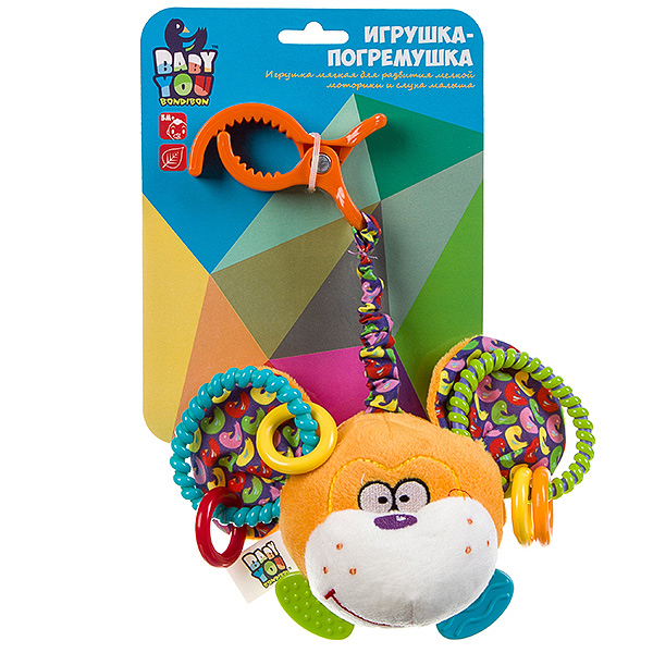Мягкая развивающая игрушка-растяжка для малышей ОБЕЗЬЯНКА из серии Baby You от Bondibon - не просто игрушка, а настоящий помощник в развитии и познании мира! Яркие цвета и причудливые формы ушек стимулируют зрительное восприятие и массируют пальчики. Погремушка издает приятный звон, который привлекает внимание и поддерживает интерес к игре. Прорезыватели-ножки с разной фактурой помогут справиться с зудом десен и разовьют тактильное восприятие. Мягкую игрушку-мартышку можно легко прикрепить к коляске, кроватке или манежу благодаря универсальному карабину-прищепке, чтобы подвеска всегда была рядом с вашим малышом, создавая атмосферу тепла и комфорта. Игрушки для новорожденных серии Бэби Ю отличаются высоким качеством, продуманным дизайном и соответствуют высоким стандартам качества бренда Бондибон. Игрушка для малышей ОБЕЗЬЯНКА с растяжкой и прищепкой способствует развитию мелкой моторики, координации движений и сенсорного восприятия. Высота игрушки – 12 см. Возраст: от 3 месяцев.