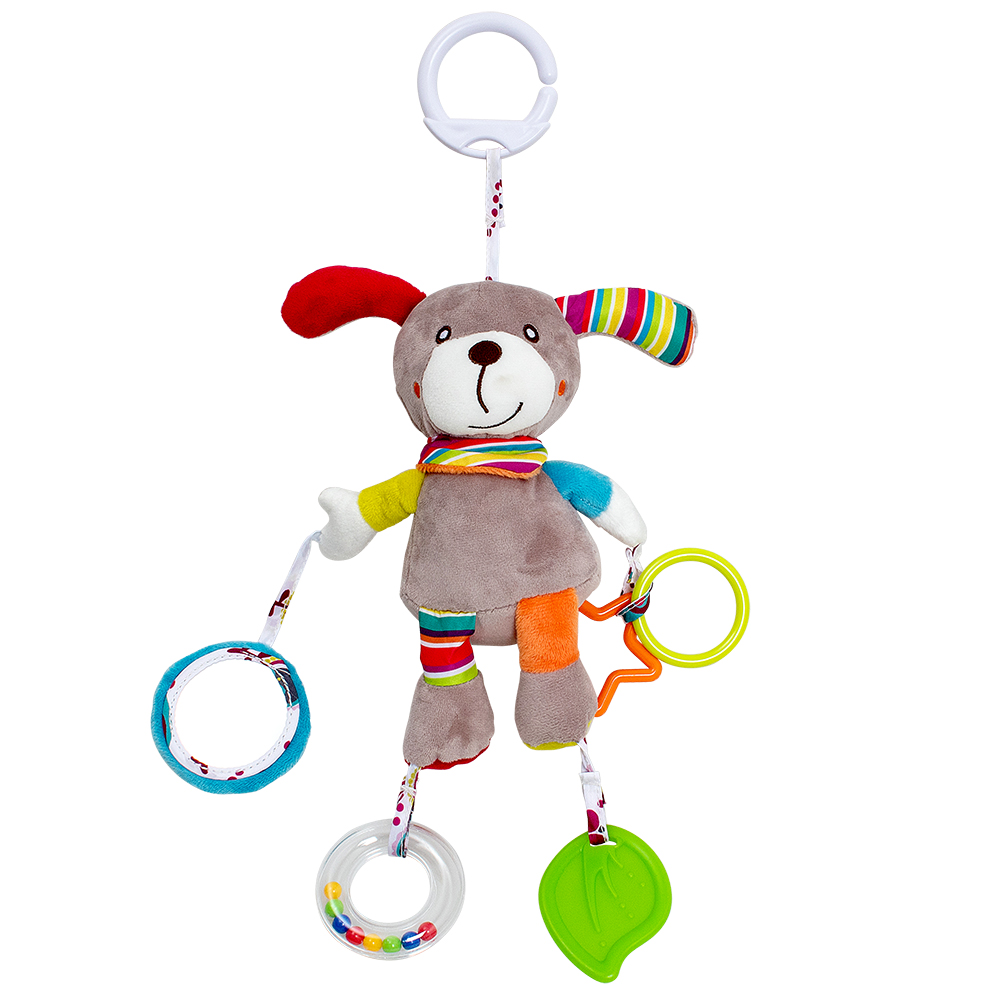 Мягкая подвеска-погремушка в виде щенка. Игрушка имеет разнофактурные материалы и звуковые эффекты за счет погремушки. Крепление подходит для кроватки или коляски, что позволит игрушке всегда оставаться на виду у ребенка. Прорезыватель поможет избавиться от неприятных ощущений у малыша. Зеркальце способствует развитию визуального и тактильного восприятия. Параметры изделия без упаковки: 38*38*7 см. Размер индивидуальной упаковки составляет 34*22*4 см.