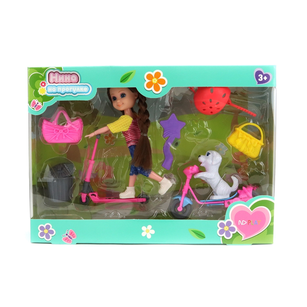 Набор с куклой «Нина на прогулке» ? прекрасный подарок для девочки. У куклы Нины милое личико, красивые волосы, модная одежда, гнущиеся ручки и ножки. В наборе с шарнирной мини-куклой есть все для веселой игры: самокат, защитный шлем, верный питомец и модные аксессуары. Высота куклы ? 16 см.Коллекция кукол с аксессуарами «Нина на прогулке» погрузит ребенка в яркий мир спортивной куколки и ее лучших друзей! Вместе они обожают активный отдых: устраивать пикник, кататься на скейте, велосипеде и самокате. В коллекцию «Нина на прогулке» входят три варианта с разным наполнением набора.