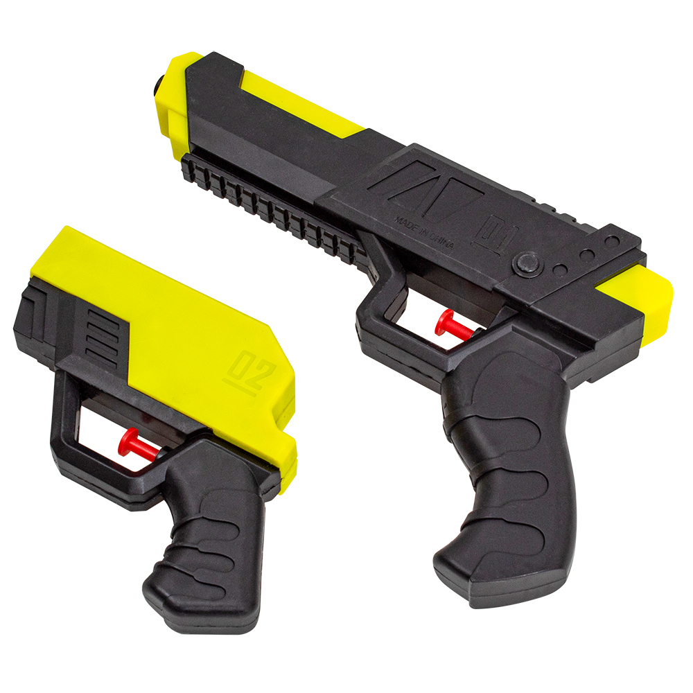 Водное оружие. Объем резервуара для воды маленького пистолета около 120 мл, большого пистолета – около 200 мл. Особенностью игрушки является возможность трансформировать два оружия в одно и наоборот. Игрушка стреляет на расстояние до 7-8 метров. При нажатии на курок осуществляется выстрел. Размер игрушки без упаковки – 21*15,5*3 см. Размер индивидуальной упаковки составляет 30*3*17 см.