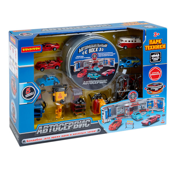 Набор игровой "АВТОСЕРВИС", складной с 5 металлическими машинами, инструментами, аппаратами, знаками, Парк Техники Bondibon