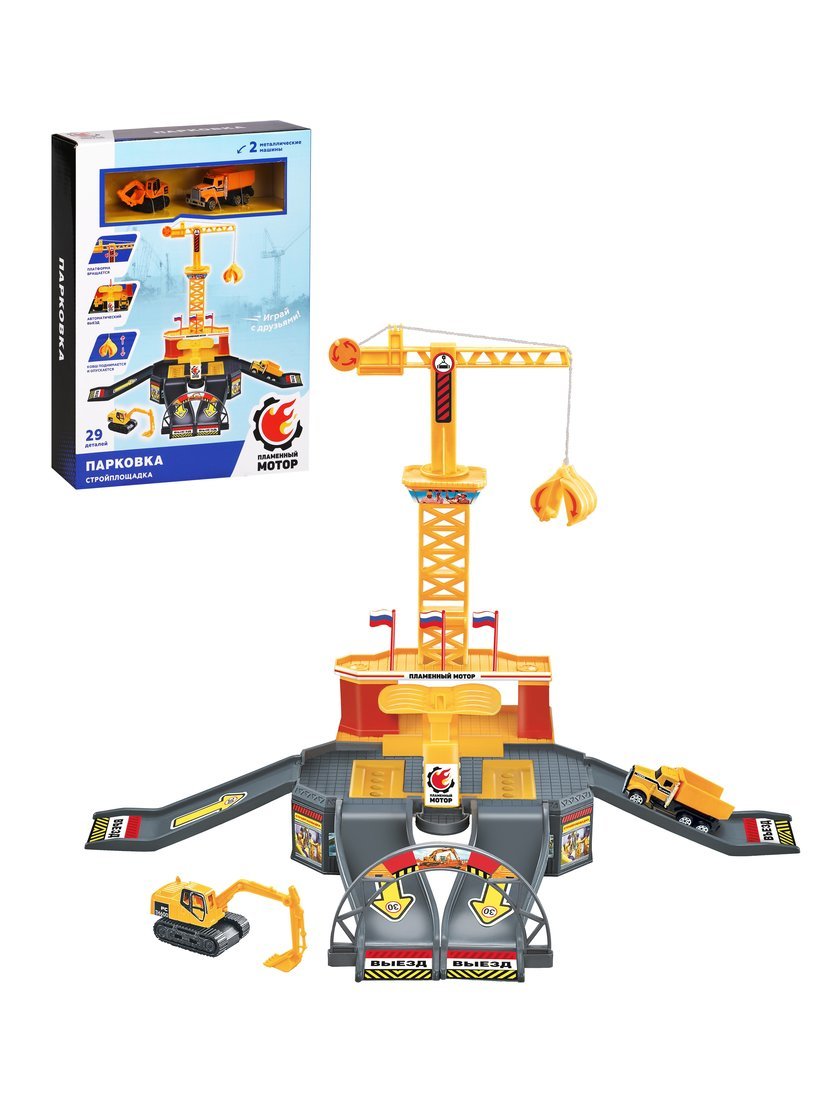 Парковка Стройплощадка, подъмный кран, вращается платформа, поднимается и опускается ковш, машины металл -2шт.