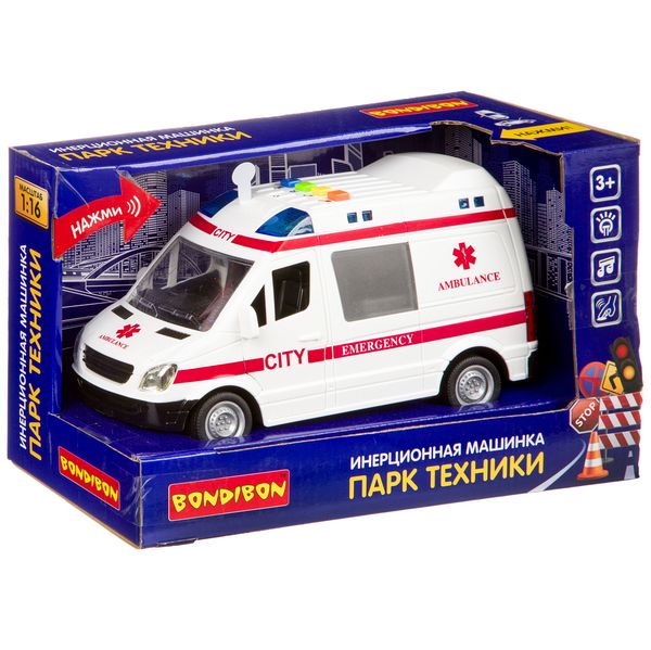 Инерционная машинка Bondibon «ПАРК ТЕХНИКИ», скорая, свет, звук BOX 27,5х12х17. ВВ4068