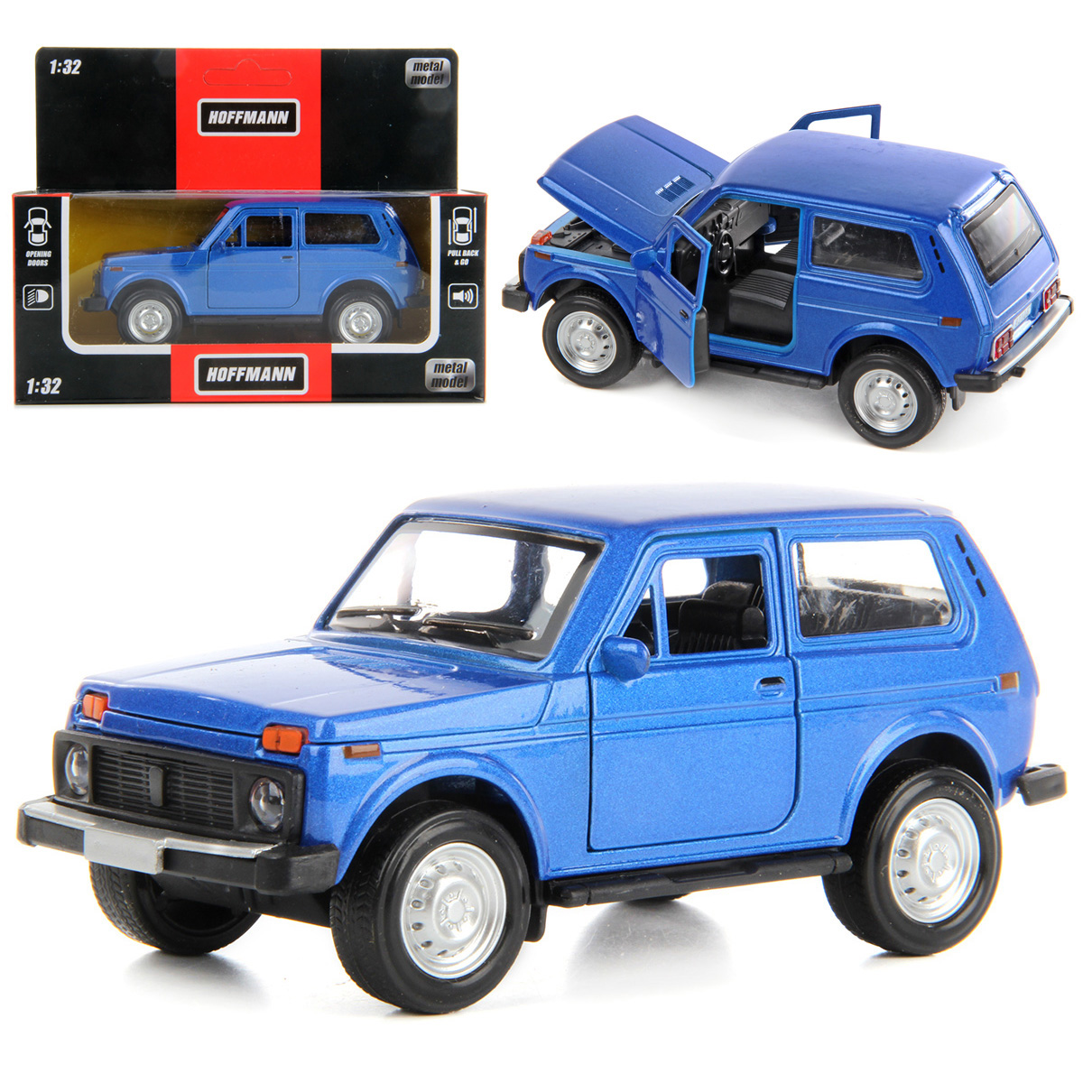 Коллекционные машинки Hoffmann - это высокий уровень проработки игрушки и любовь к деталям. Машинка имеет прорезиненные колеса, снабжена инерционным механизмом и открывающимися дверками салона, ездит вперед-назад. У автомобиля прозрачные стекла, через которые виден весь салон, уровень детализации салона заслуживает высших похвал. Если нажать на корпус машинки, она издаст звук заводящегося мотора, передние и задние фары будут подсвечиваться. Капот открывается. Благодаря такой машинке ребенок будет с удовольствием играть в сюжетно-ролевые игры, развивая воображение, осваивать новые социальные роли, а еще тренировать координацию движений и ловкость. Соберите всю коллекцию машинок Hoffmann, с которой ребенок проведет множество веселых и увлекательных часов. Машинка работает от 3 батареек LR44, входят в комплект. Игрушка изготовлена из металла. Упакована в коробку с картонным хедером с отверстием. Масштаб машинки 1:32. Размеры автомобиля: 13,5*6*6 см. Размеры коробки: 17*7,5*13,5 см.